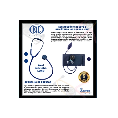 Estetoscópio DUPLO INOX ADULTO BIC. 01 Aparelho de Pressão Adulto em Nylon com Fecho de Contato BIC Caracteristicas: Braçadeira: Confeccionada em tecido nylon de alta resistência e com tecnologia inovadora sem costura; Fecho de contato: Duplo com 2 camadas de gancho, melhor travamento no braço e não solta ao inflar; Manguito: Bolsa com tubos interligados entre manômetro, válvula e pêra, confeccionada em PVC antialérgico, isento de látex; Pêra: