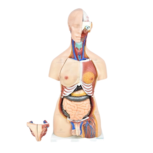 Modelo anatômico de Torso bissexual dividido em 24 Partes de 85 cm de altura, confeccionado em PVC e resina plástica emborrachada, é uma excelente ferramenta para entender o corpo humano de forma geral;