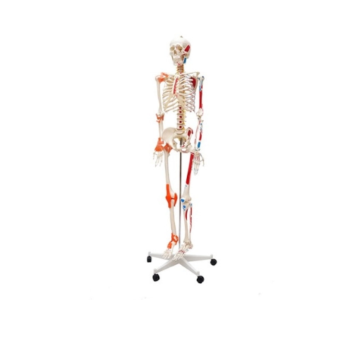 Confeccionado em PVC, com pintura feita à mão e cores realisticas. Apresenta alta fidelidade anatômica, Articulações com Ligamentos do lado direito, Inserções e origens Musculares do lado esquerdo (Pintadas em Vermelho e Azul).