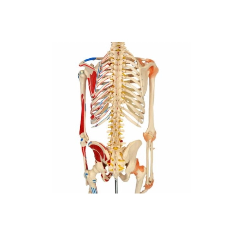Com o modelo anatômico de esqueleto SD-5001 podemos identificar do lado esquerdo inserções e origem muscular em cores azul e vermelho respectivamente e é possivel identificar os seguintes ossos entre outras estruturas: