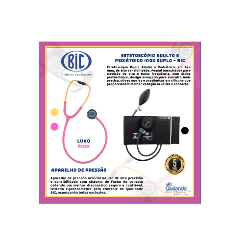 Estetoscópio DUPLO INOX ADULTO BIC. 01 Aparelho de Pressão Adulto em Nylon com Fecho de Contato BIC Caracteristicas: Braçadeira: Confeccionada em tecido nylon de alta resistência e com tecnologia inovadora sem costura; Fecho de contato: Duplo com 2 camadas de gancho, melhor travamento no braço e não solta ao inflar; Manguito: Bolsa com tubos interligados entre manômetro, válvula e pêra, confeccionada em PVC antialérgico, isento de látex