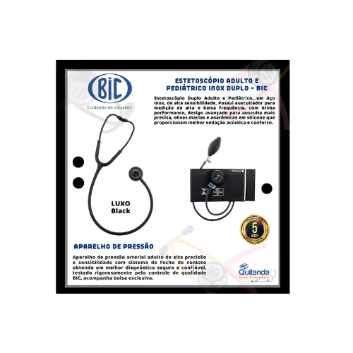 Estetoscópio DUPLO INOX ADULTO BIC. 01 Aparelho de Pressão Adulto em Nylon com Fecho de Contato BIC Caracteristicas: Braçadeira: Confeccionada em tecido nylon de alta resistência e com tecnologia inovadora sem costura; Fecho de contato: Duplo com 2 camadas de gancho, melhor travamento no braço e não solta ao inflar; Manguito: Bolsa com tubos interligados entre manômetro, válvula e pêra, confeccionada em PVC antialérgico, isento de látex; Pêra:
