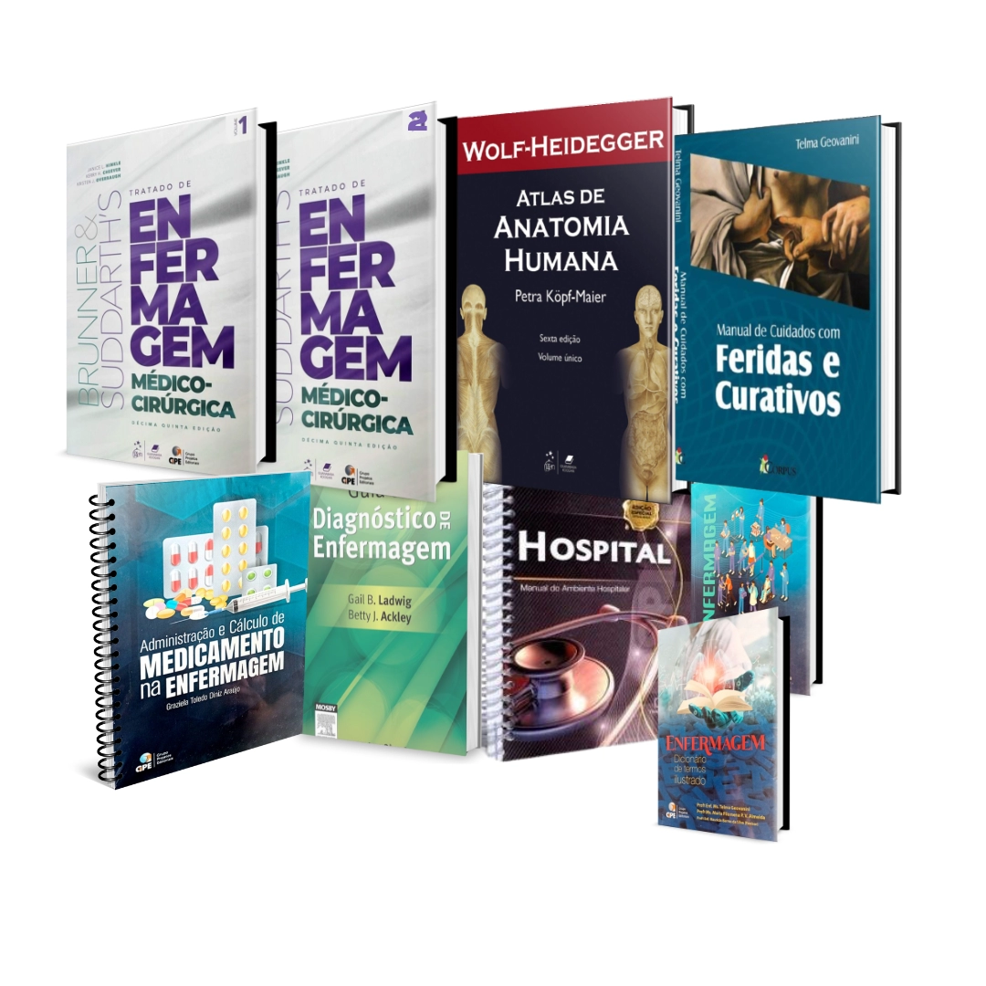 O Kit é composto pelos seguintes livros: Tratado de Enfermagem Médico Cirúrgica - BRUNNER & SUDDARTH, Administração e Cálculos de Medicamentos na Enfermagem; Black Book - Hospital, Atlas de Anatomia Humana - Wolf; Manual de Cuidados com Feridas e Curativos; Enfermagem – Procedimentos de Estágio; Enfermagem – Dicionário de Termos Ilustrado; Diagnósticos de Enfermagem - Formas de Pagamento: => Boleto em 10x sem juros, com a Primeira parcela para 60 dias => Cartão: Parcelado em 10x sem juros => Avista - 10% de Desconto - Prazo de Entrega: 15 Dias Úteis Importante: Após finalizar a compra você será direcionado para nosso whatsapp onde será realizado um atendimento personalizado para então finalizarmos a venda!