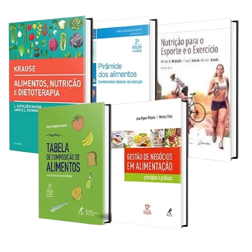 Este kit é composto pelos seguintes produtos: Krause – Alimentos, Nutrição e Dietoterapia 14°Edição; Nutrição para o Esporte e o Exercício; Pirâmide dos Alimentos: Fundamentos Básicos da Nutrição; Tabela de Composição de Alimentos; Gestão de Negócios em Alimentação. Formas de Pagamento: => Boleto em 10x sem juros, com a Primeira parcela para 60 dias => Cartão: Pacelado em 10x sem juros, A vista - 10% de Desconto - Prazo de Entrega: 15 Dias Úteis Importante: Após finalizar a compra você será direcionado para nosso whatsapp onde será realizado um atendimento personalizado para então finalizarmos a venda!