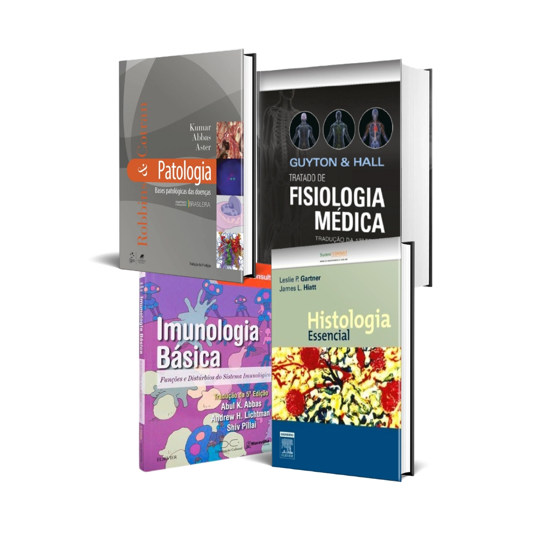 Este Kit é composto pelos seguintes produtos: Histologia Essencial; Quimica Clinica Imunologia Básica; Tratado de Fisiologia Médica Guyton & Hall – 12ª Edição; Robbins e Cotran Patologia – Bases Patológicas das Doenças. Formas de Pagamento: => Boleto em 10x sem juros, com a Primeira parcela para 60 dias => Cartão: Pacelado em 10x sem juros => Avista - 10% de Desconto - Prazo de Entrega: 15 Dias Úteis Importante: Após finalizar a compra você será direcionado para nosso whatsapp onde será realizado um atendimento personalizado para então finalizarmos a venda!