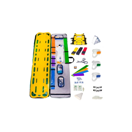 - 1 Capa para kit Cipa - 1 Prancha longa em polietileno - 1 Conjunto de 3 cintos de engate rápido (Amarelo, Vermelho e Preto) - 1 Jogo de tala aramada em borracha tipo E.V.A. com 4 tamanhos - 1 Bandagem triangular tam M.: 100 x 100 x 140 cm - 1 Colar cervical P - 1 Colar cervical M - 1 Colar cervical G - 1 Manta térmica aluminizada - 4 Pares de luvas cirúrgicas estéreis - 1 Tesoura ponta romba - 2 Óculos de proteção - 4 Ataduras de crepe 10 x 1,20 cm - 4 Ataduras de crepe 15 x 1,20 cm - 1 Fita Micropore 25 mm x 10 m - 2 Máscaras RCP descartável.